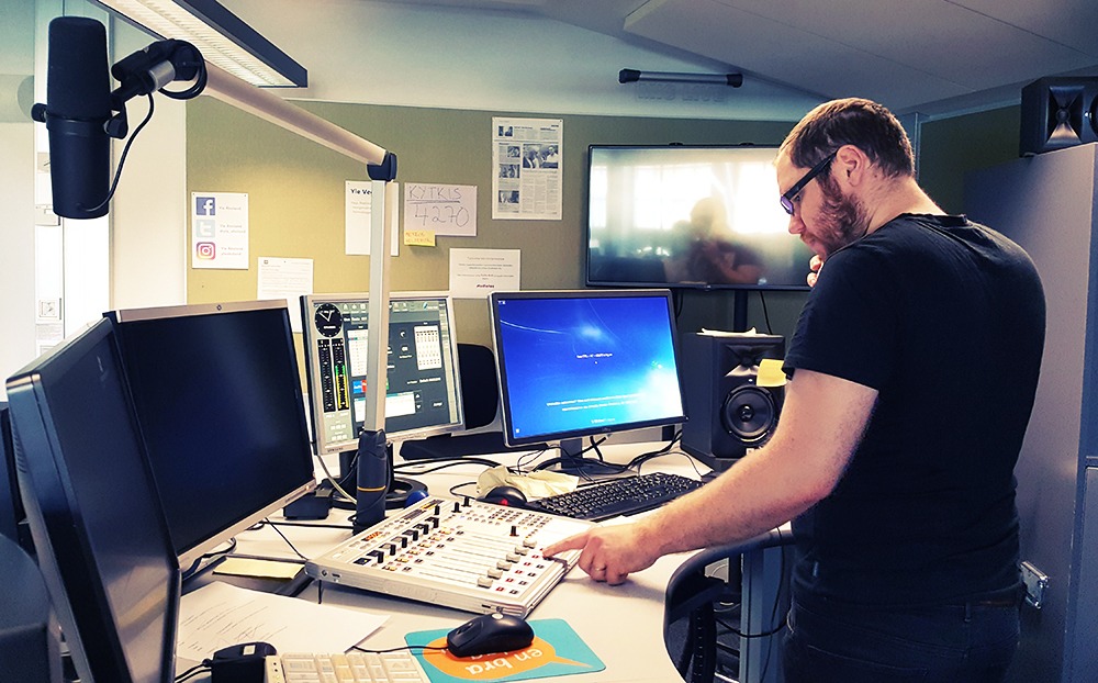 Med mig hade jag min man som ljudtekniker. Han har arbetat på Yle i många år förut och gör ännu inhopp när det behövs. Det var skönt att ha honom med som moraliskt stöd, och så fick han reda ut det tekniska strulet.