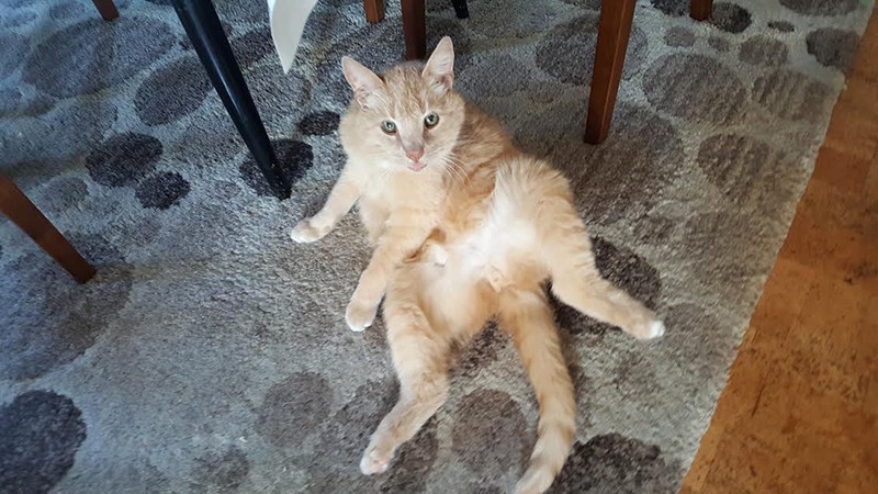 Ibland ska det vara något ännu bättre, som en skiva lördagskorv, eller två. Eller så vill han slicka margarin från en bit knäckebröd. Sedan sätter han sig ett hörn av köksmattan. Alltid samma hörn. Det betyder att han kräver att bli borstad eller klappad. Det här har han ljudligt börja förmedla sedan han blev äldre.