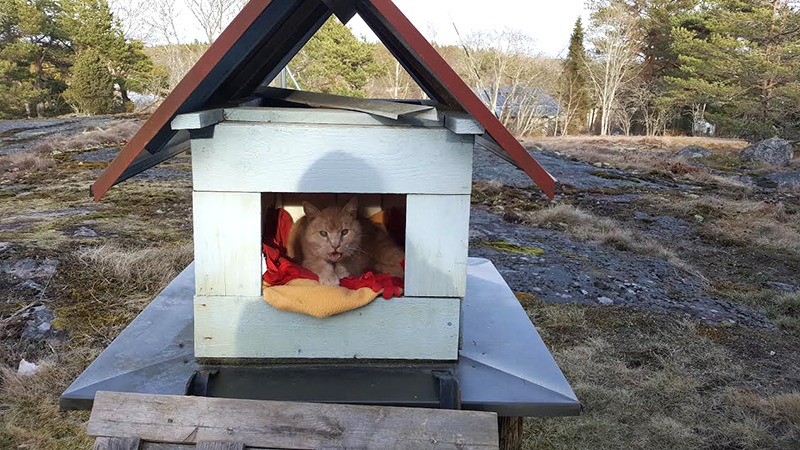 Sedan ska han plötsligt ut. Det hjälps inte att jag ligger i badet. Han kommer in i badrummet och gnäller otåligt, ända tills jag stiger upp och släpper ut honom när jag inte kan bada i lugn och ro. Han går till ytterdörren och jag öppnar den. Där ska han sedan stå och fundera och vela. Ska han faktiskt ut, eller kan han få ner en bit fisk till? Plötsligt ändrar han sig vid dörren och kommer på att han ska ut ur en annan dörr i köket istället. Därifrån är det närmare till hans koja, som är en miniversion av mina föräldrars hus.