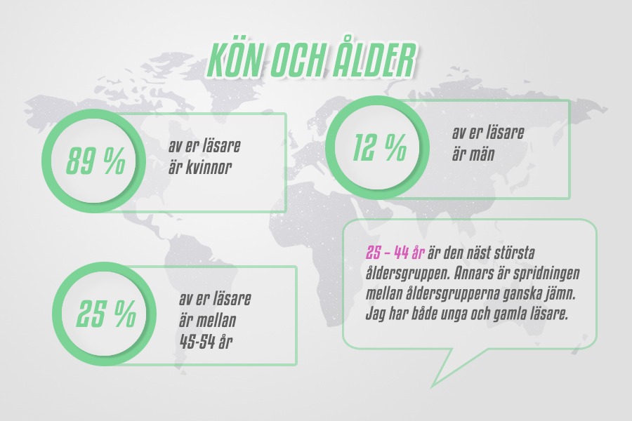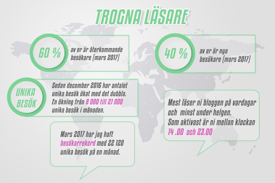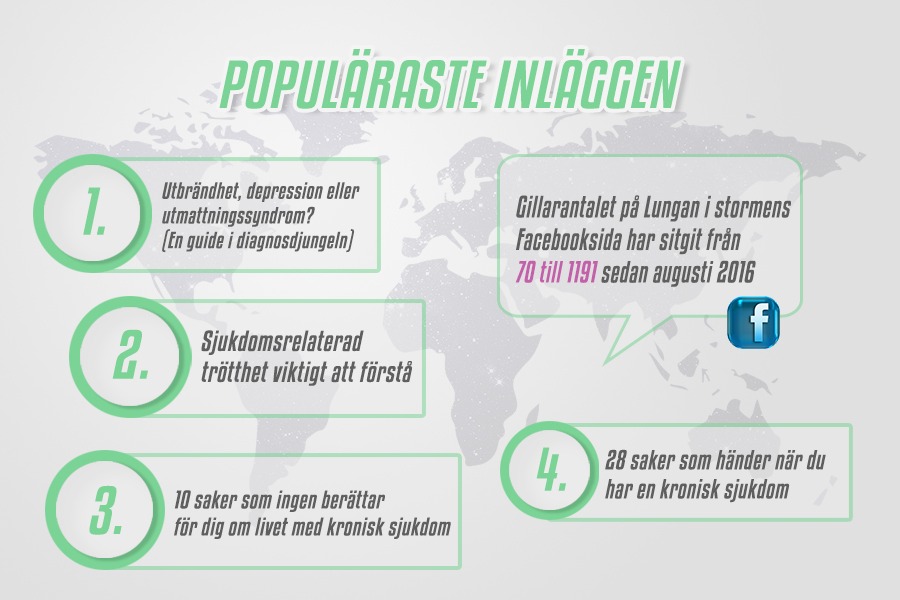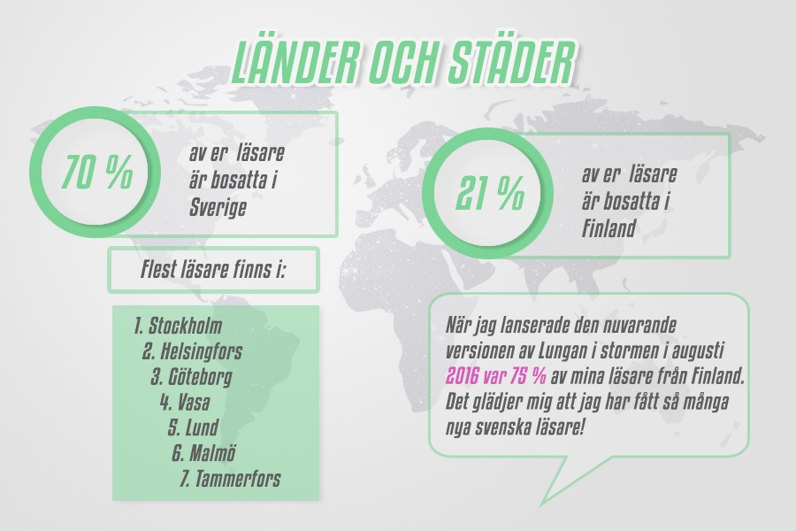 Jag har lagt ihop lite intressant läsarstatistik för er som följer Lungan i stormen att ta del av. Sedan dess att jag lanserade om Lungan i stormen i dess nuvarande form i augusti 2016 har besöken ökat med mer det dubbla. Det glädjer mig att sidan har vuxit så mycket på så kort tid! I statistiken har jag tagit med bland annat länder, städer, kön, ålder, besökarantal och populära inlägg.