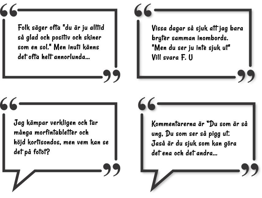 Det finns många missuppfattningar och förutfattade meningar om kronisk sjukdom. Många tror att man måste se sliten och bedrövad ut, eller vara sängliggande, isolerad i sitt hem eller på sjukhus. Sanningen är den att livet kan se ut precis hur som helst trots att man har en eller flera livshotande sjukdomar.