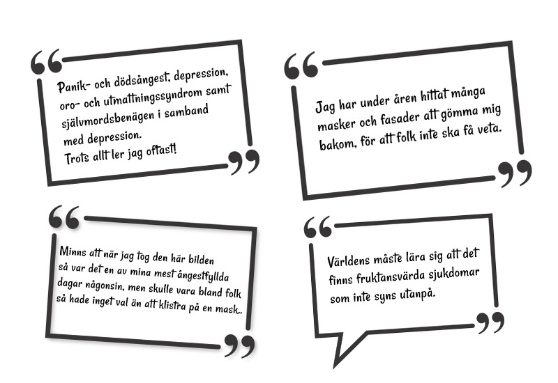 Döm aldrig någon för hur de ser ut på utsidan. Anta inget. Leta inte efter bedragare, för sanningen är den att du inte kan veta hur dåligt någon mår på insidan! Här är 100 ansikten av psykisk ohälsa.